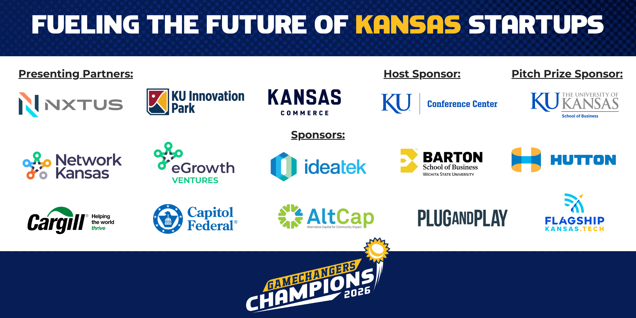 --- Gamechangers & Champions is a $25,000 statewide pitch competition, presented in partnership with KU Innovation Park and the Kansas Department of Commerce, designed to identify and elevate high-growth startups from across Kansas.